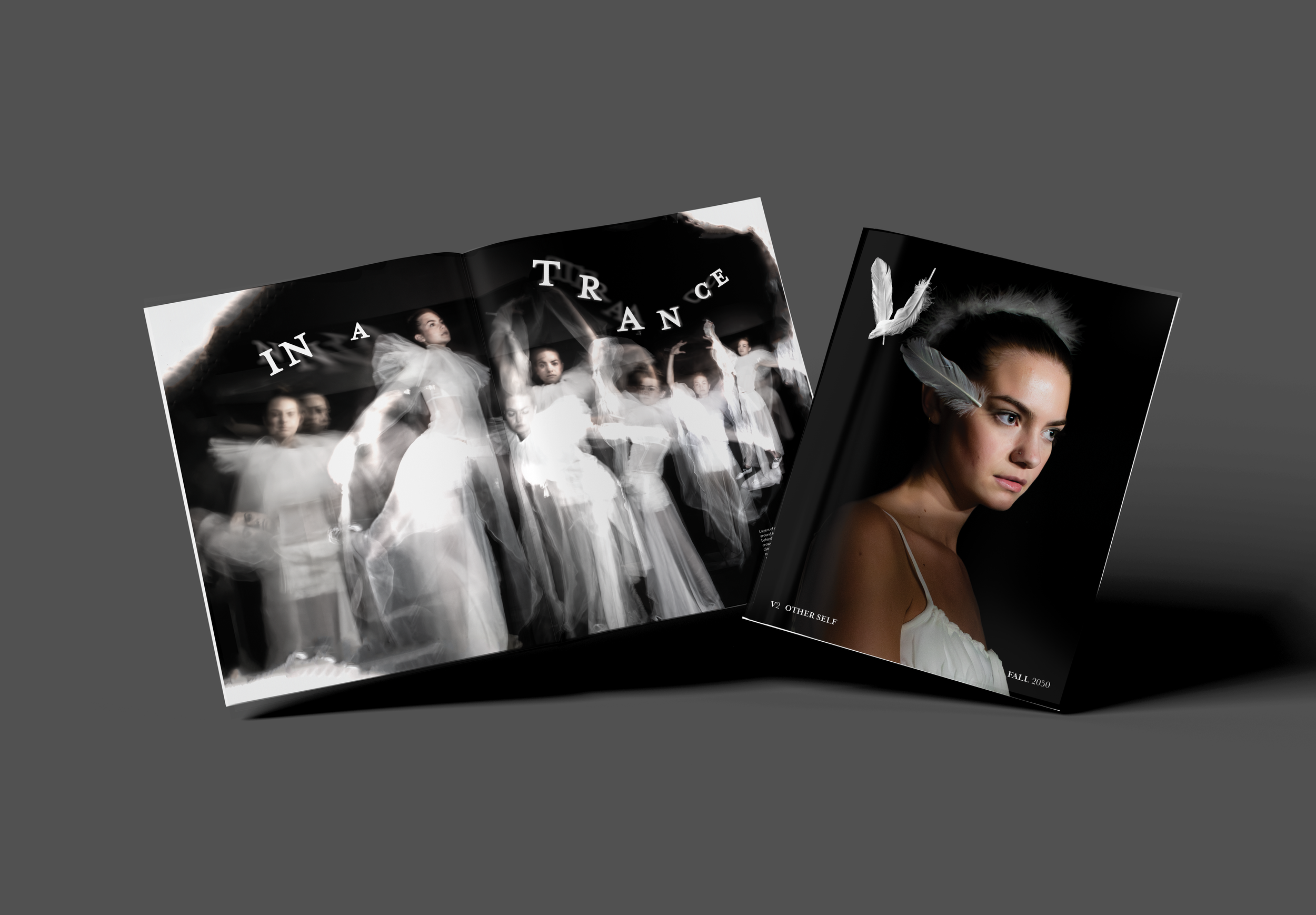 I designed Black Swan, a fashion editorial magazine exploring themes of duality, transformation, and quiet chaos through a dark, high-fashion lens. Through dramatic imagery, layered typography, and controlled negative space, the magazine follows a visual progression from restraint to intensity, mirroring the tension between elegance and unraveling control. A primarily monochromatic palette is interrupted by moments of stark contrast, while the typography gradually becomes more expressive and intrusive, reinforcing the narrative shift across each spread.